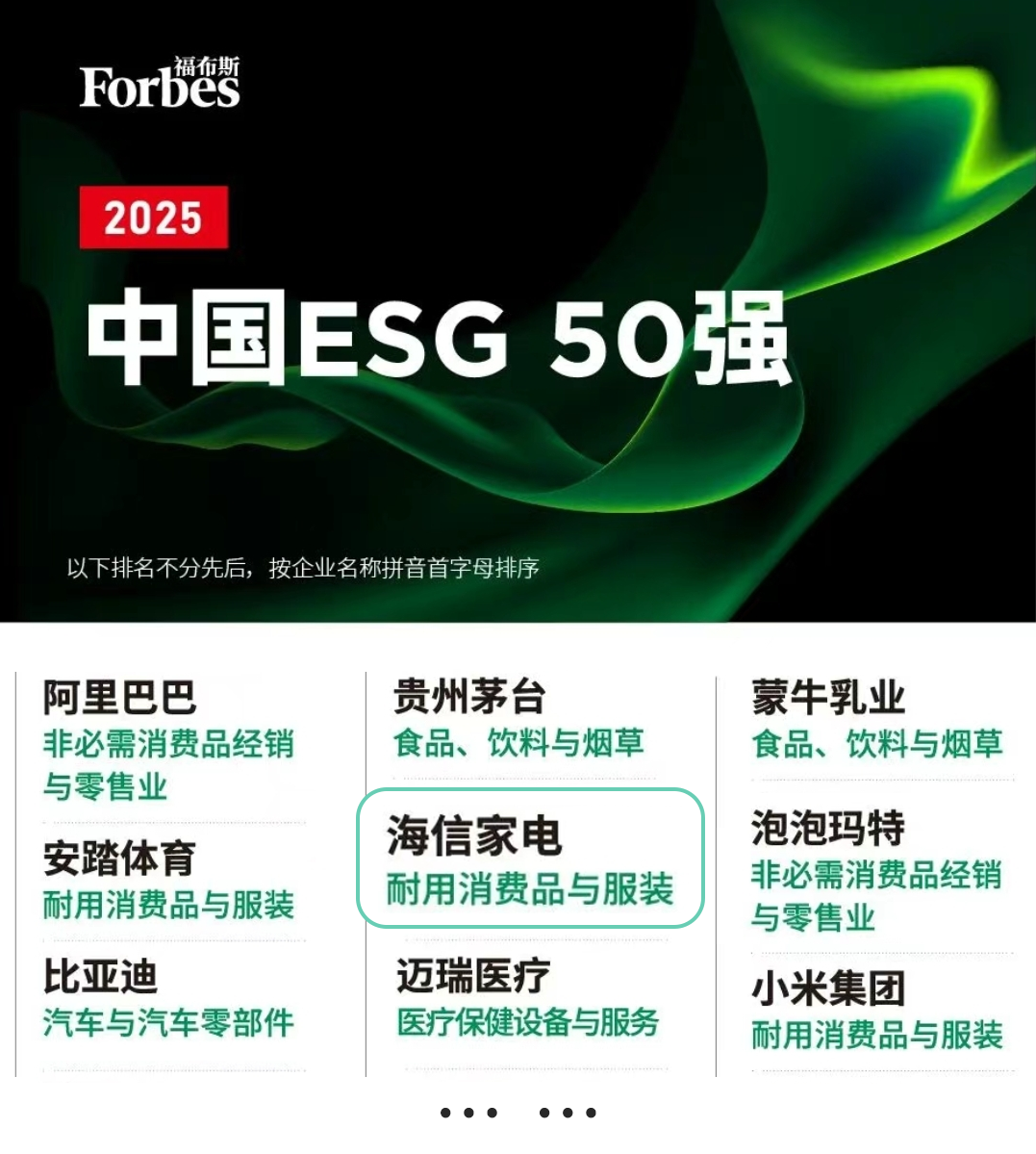 9月11日,福布斯中国发布2025中国ESG 50榜单,海信家电(SZ 000921,HK 00921)凭借在ESG领域的实践成效与创新探索再度入选,连续两年获得这一重磅殊荣。